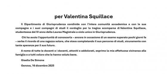 Il Dipartimento di Giurisprudenza condivide con l’intera comunità accademica e con le sue compagne e i suoi compagni di studi il cordoglio per la tragica scomparsa di Valentina Squillace, studentessa del IV anno della Laurea Magistrale a ciclo unico in Giurisprudenza.
